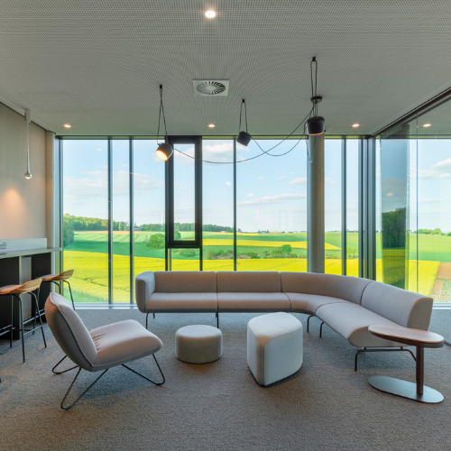 Im Zentrum steht ein 27 Meter hoher, sechsgeschossiger Turm, der sich über einem langgestreckten Flachbau erhebt. Der Empfangsbereich und das Mitarbeiter-Bistro moxxy gehen fließend ineinander über und bilden eine offene Kommunikationszone, die Austausch, Vernetzung und kreative Zusammenarbeit fördert – sowohl intern als auch im direkten Kontakt mit Kunden.