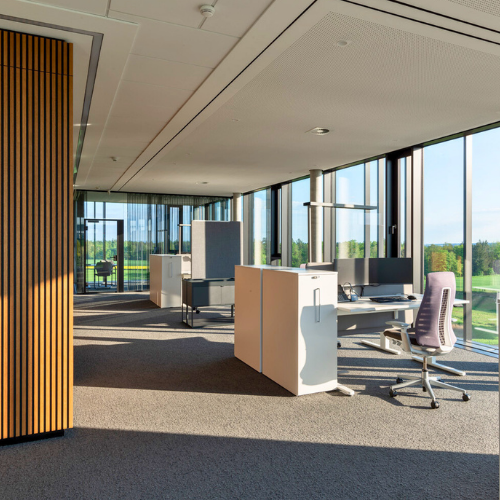 Die offenen Bürogeschosse folgen einem Open-Space-Konzept, das Agilität und Flexibilität in den Vordergrund stellt. Ergänzend schaffen Besprechungsräume, Video-Call-Zonen und Lounges auf jeder Etage Raum für konzentriertes Arbeiten und persönlichen Austausch. Die Innenarchitektur setzt auf die Balance von Minimalismus und hochwertigen Materialien, eingebettet in fein abgestimmte Farbwelten.