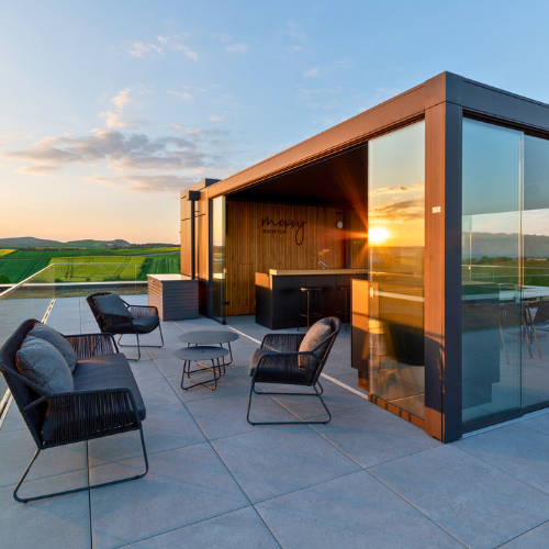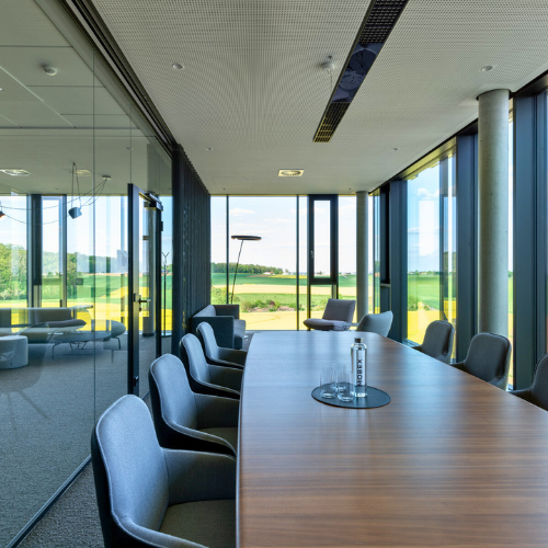 Die Fassade der MOBEX-Zentrale verbindet gestalterische Prägnanz mit technischer Raffinesse. Großflächige Sonnenschutz-Isoliergläser der Marke INFRASTOP® sorgen für Transparenz und lichtdurchflutete Arbeitsbereiche, während sie zugleich hohen Anforderungen an Wärmedämmung, Sonnenschutz und Schallschutz gerecht werden. Mit ihrer Dreifachverglasung und automatisierten Beschattungssystemen schafft die Glasfassade ein ganzjährig angenehmes Raumklima – unabhängig von Witterung und Außentemperaturen.